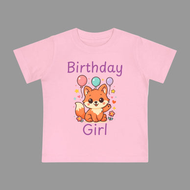 Soft, light, and sweet — this baby tee brings a little celebration to every tiny mover. A cheerful fox sits amid pastel balloons and confetti, with "Birthday Girl" in friendly purple lettering. The breathable, airlume-combed cotton keeps her comfortable through cake-smudged play and candle-blown wishes. Crisp printing on a clean white canvas makes the design pop, while the tear-away label and stabilized neck seam keep things gentle on sensitive skin. A simple, joyful piece that fits into everyday moments and makes birthday mornings feel special.