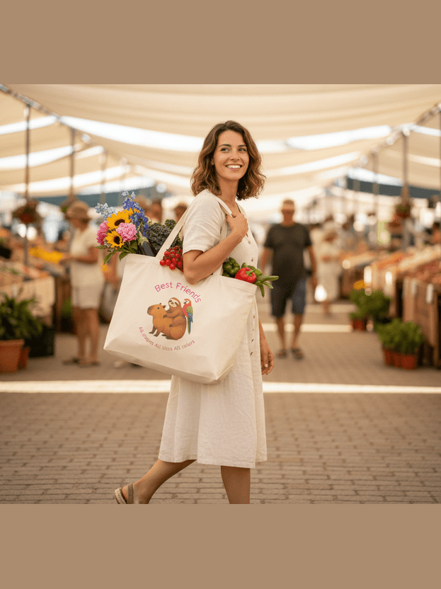 Lightweight, grounded, and quietly joyful — this large eco tote carries more than groceries. Made from sturdy 100% organic cotton twill, it feels soft in your hands while holding up to 30 lbs and daily wear. The wide flat bottom and generous 6‑gallon (23 L) capacity make room for market finds, library stacks, beach towels, or a weekend picnic. Natural tones and a playful illustration of three animal friends give it a gentle, inclusive vibe that reads like a little neighborhood smile. Because it’s OEKO‑TEX, OCS and GRS certified and PETA‑approved vegan, bringing this bag into your routine also feels like a small, responsible choice — practical, sustainable, and quietly cheerful for errands, outings, and everyday carry.